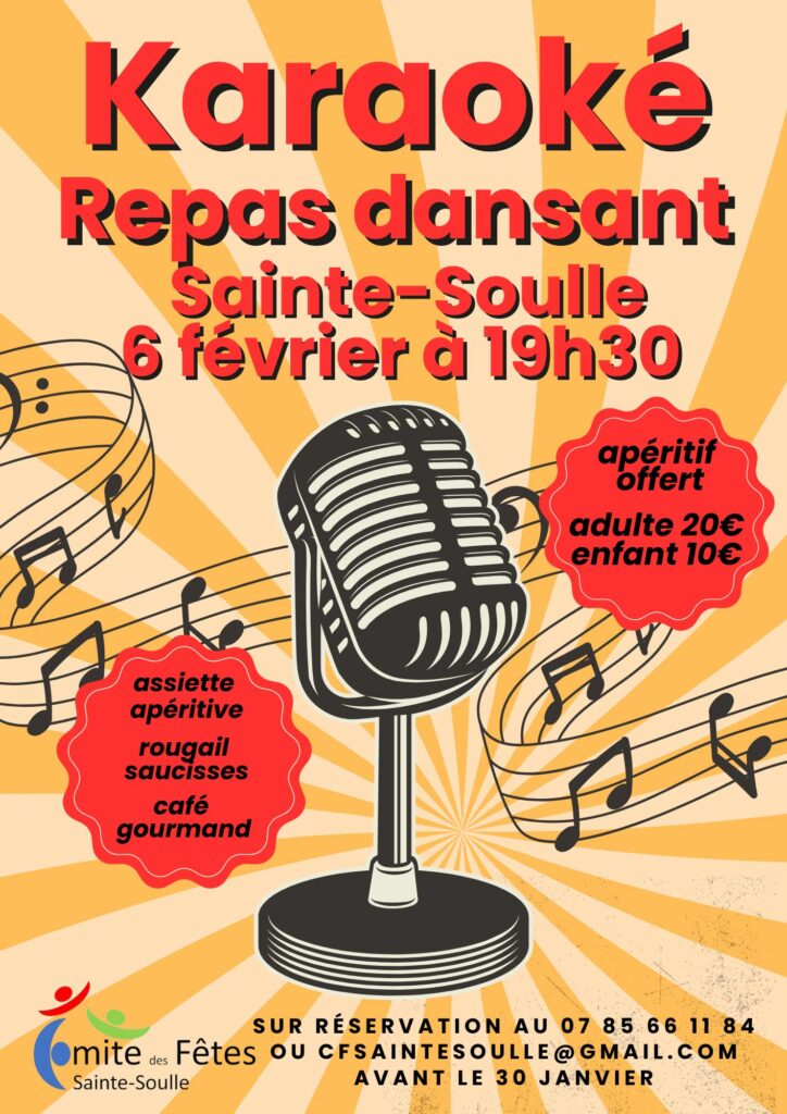 Repas dansant karaoké le 14 février 2025, salle des fêtes de Sainte Soulle